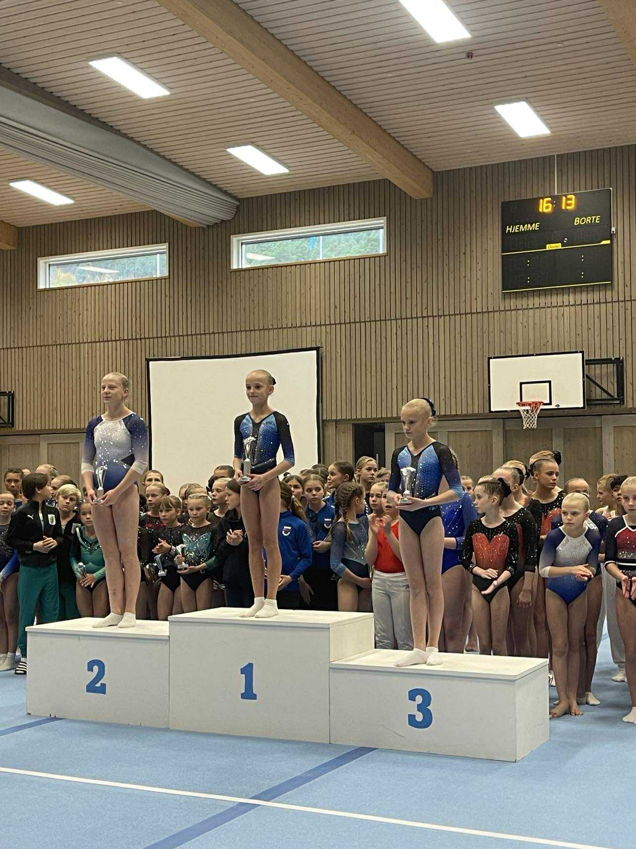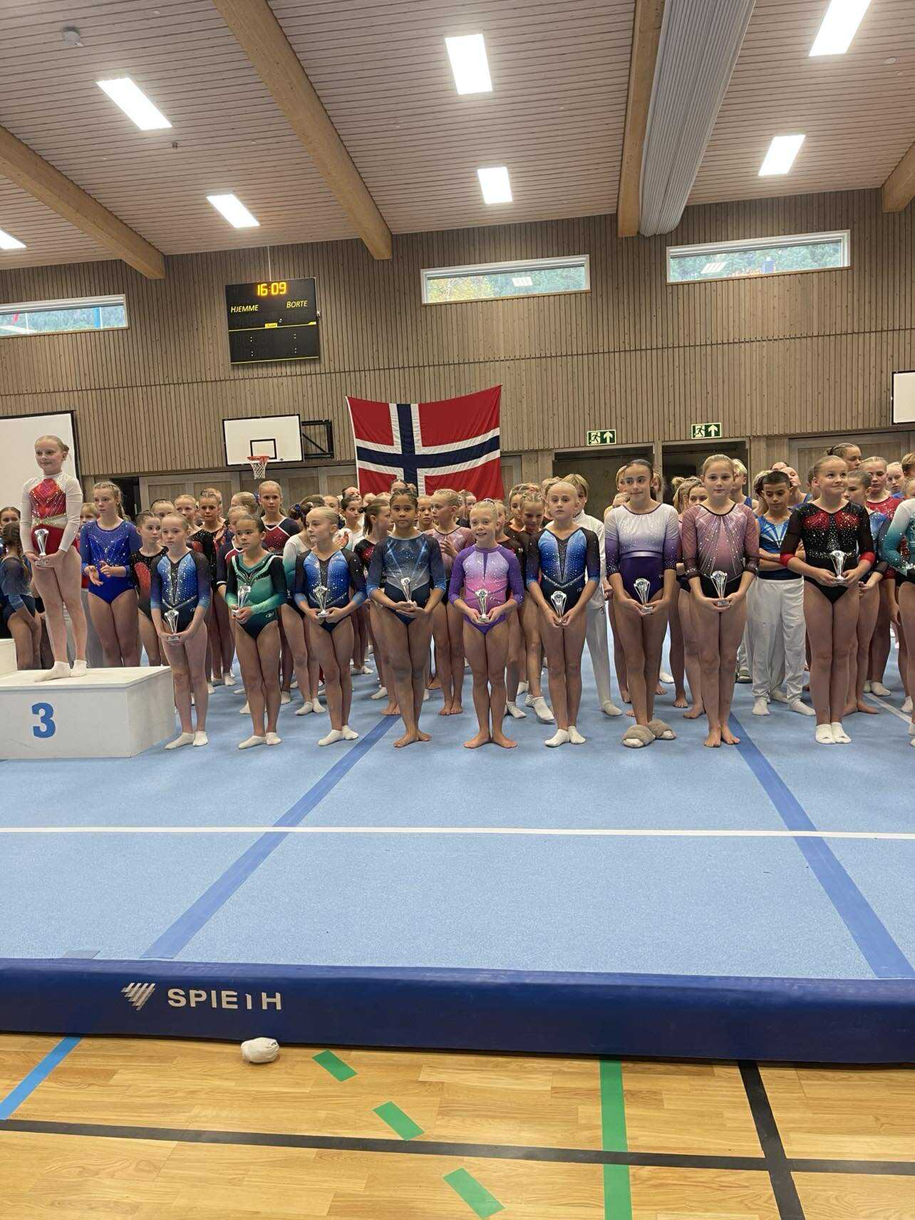 12-åringer: – Madeleine tok 1. plass,🥇 Madikken tok 3. plass🥉 og Celine tok 13. plass, Hedda 29, Lilly 31, Rani 49 og Eva 53. av 102 gymnaster.
